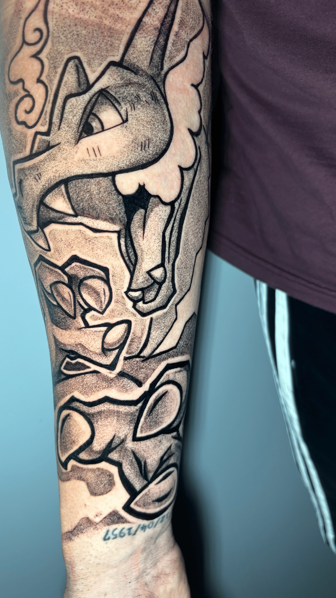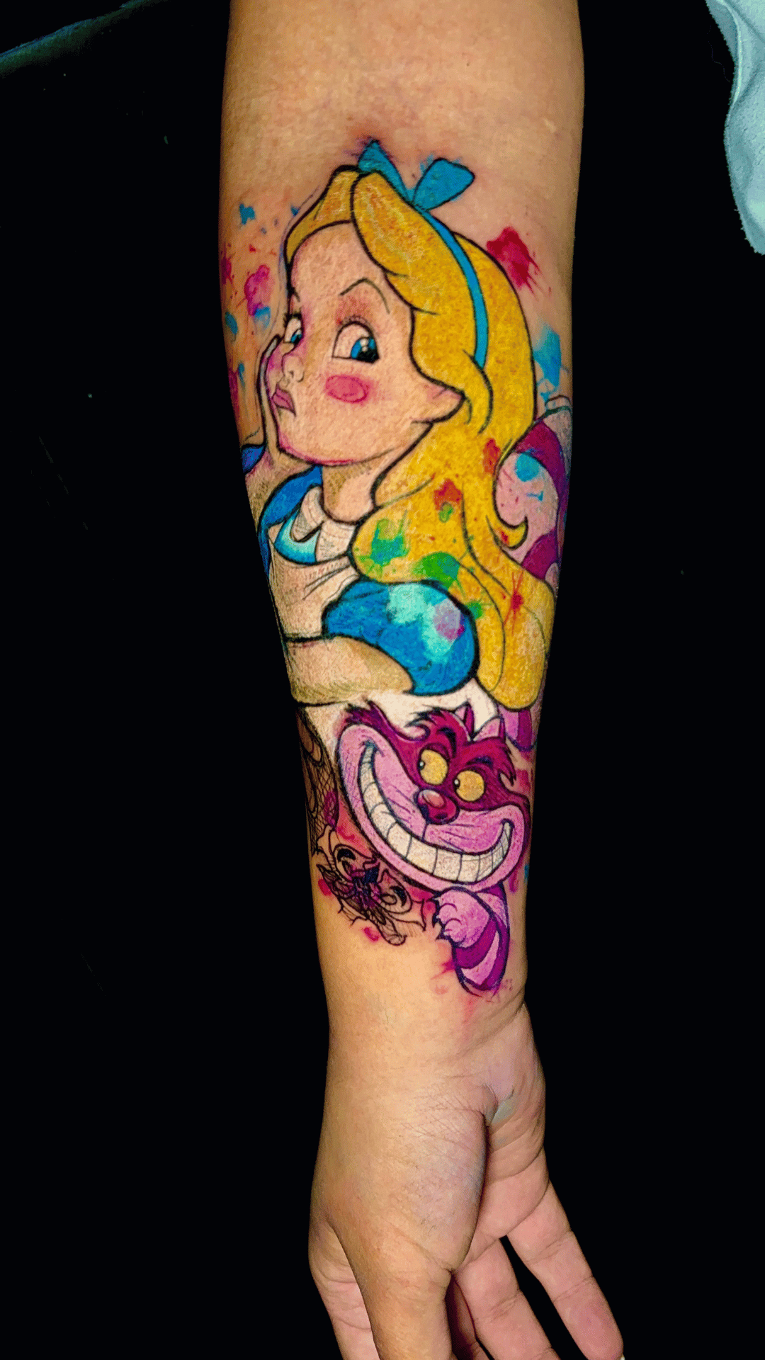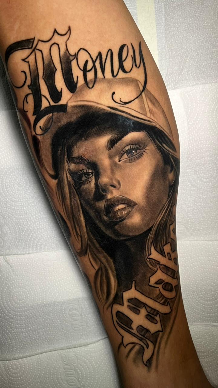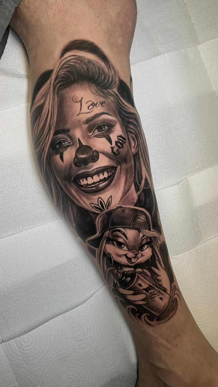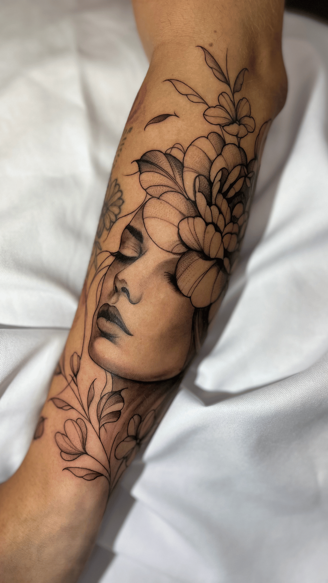 Tatuadora de realismo preto e cinza com colorido e reformas